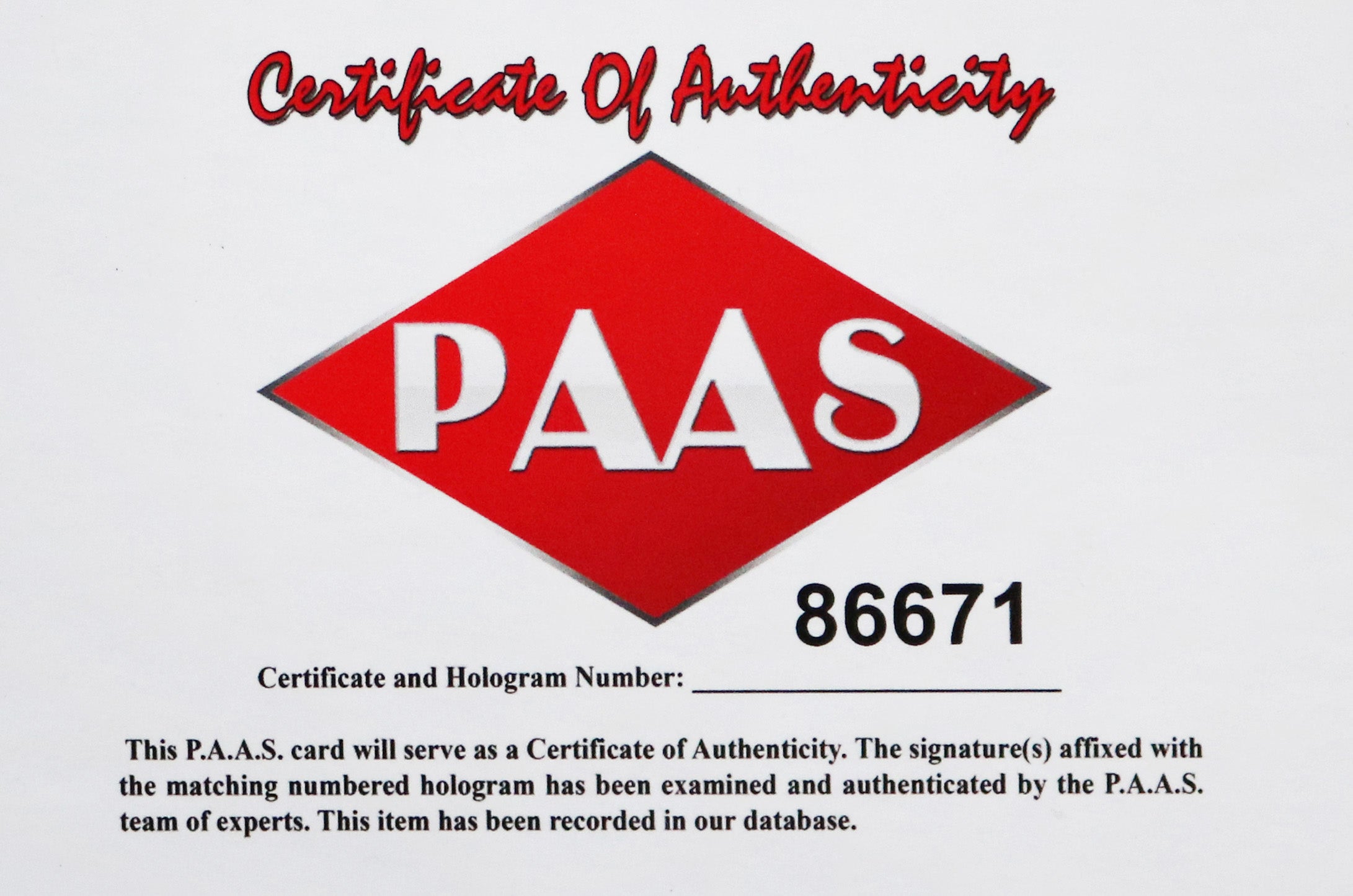 Autographed Item comes with a Certificate of Authenticity (COA) Card from PAAS Professional Autograph Authentication Services