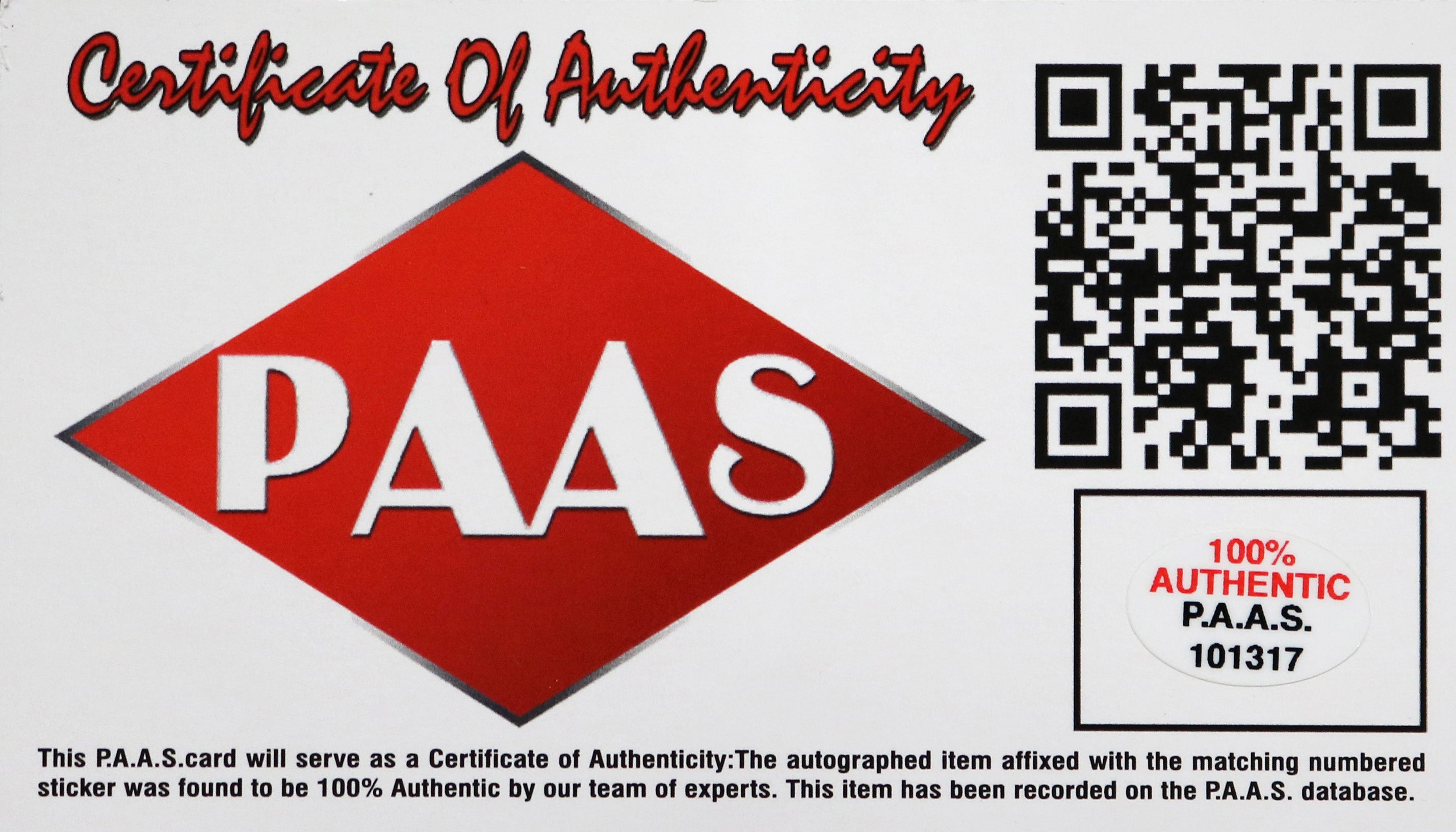 Autographed item comes with Certificate Of Authenticity (COA) Card from PAAS Professional Autograph Authentication Services