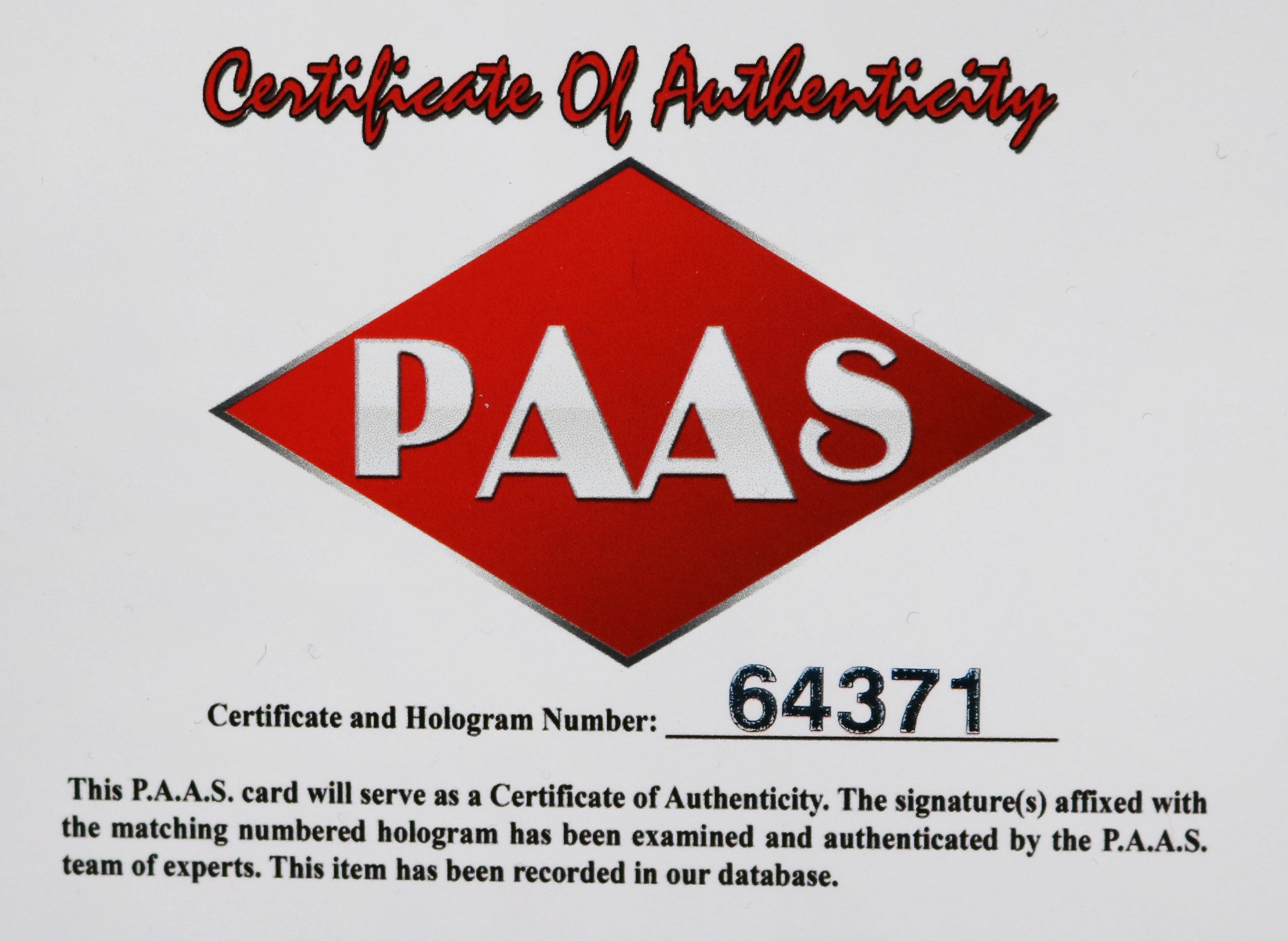 Autographed item comes with Certificate Of Authenticity (COA) Card from PAAS Professional Autograph Authentication Services