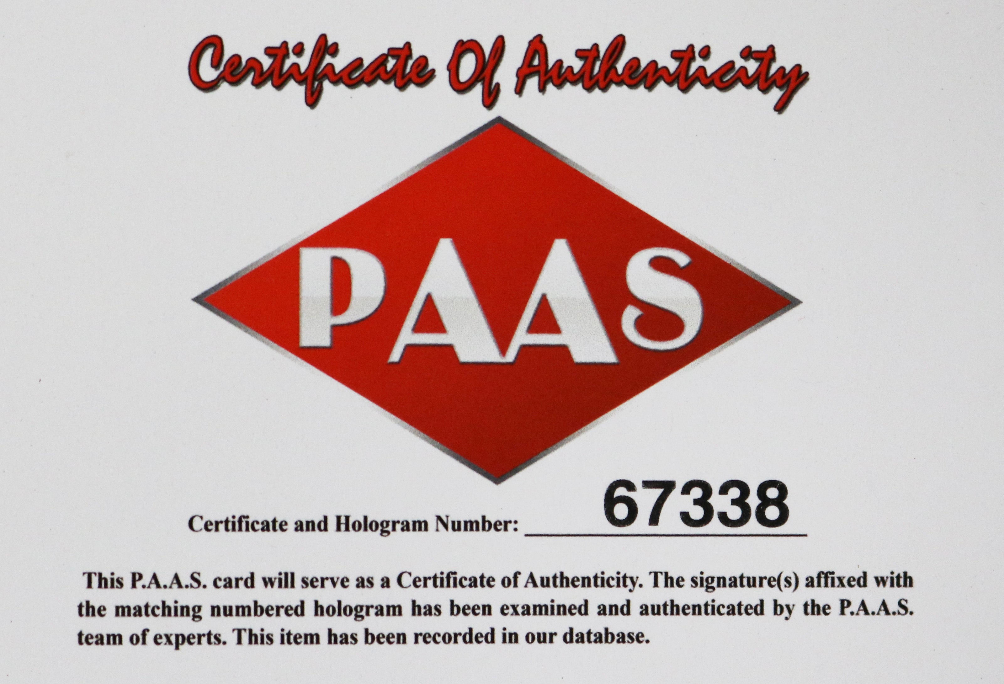 Autographed item comes with Certificate Of Authenticity (COA) Card from PAAS Professional Autograph Authentication Services