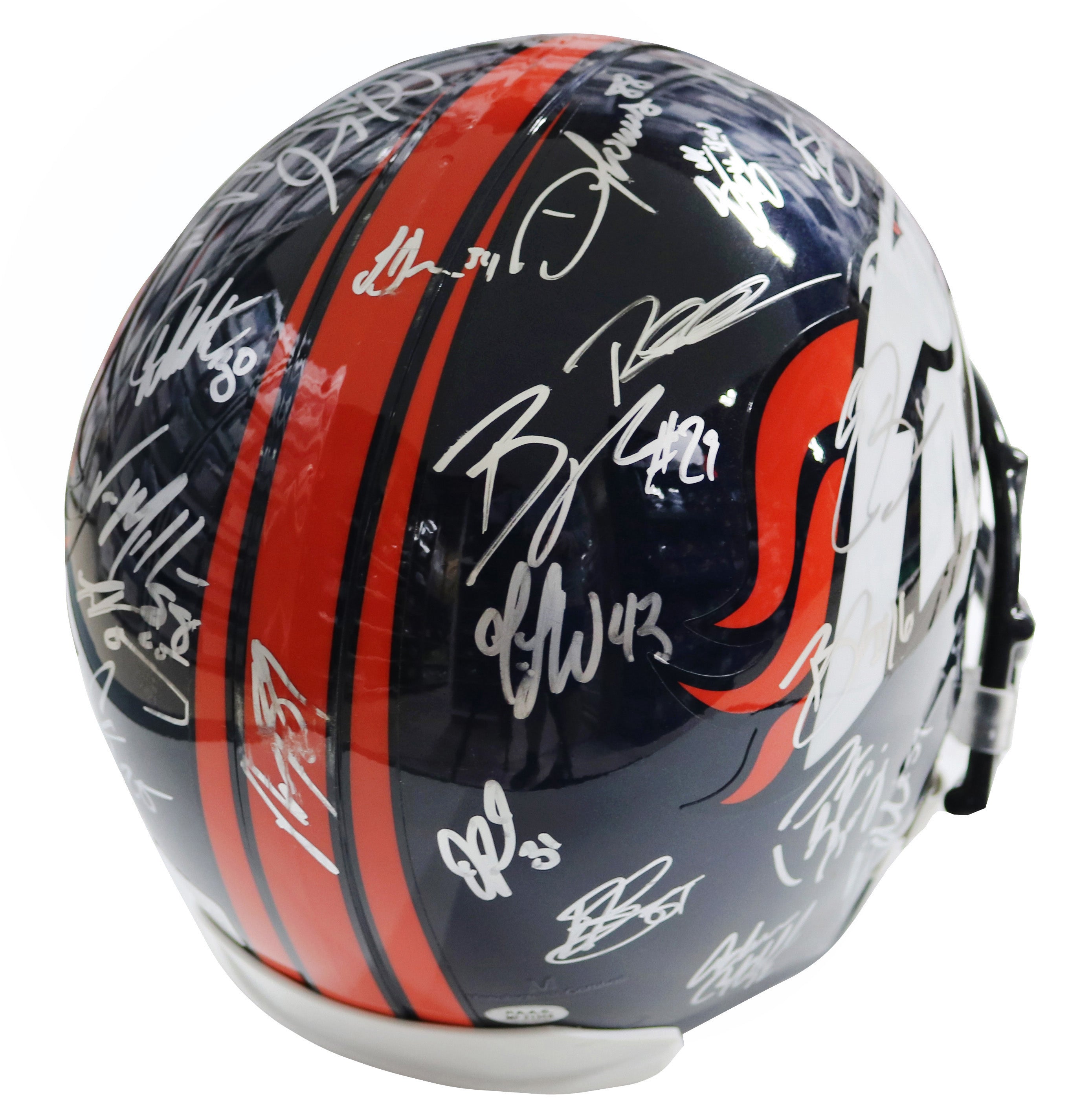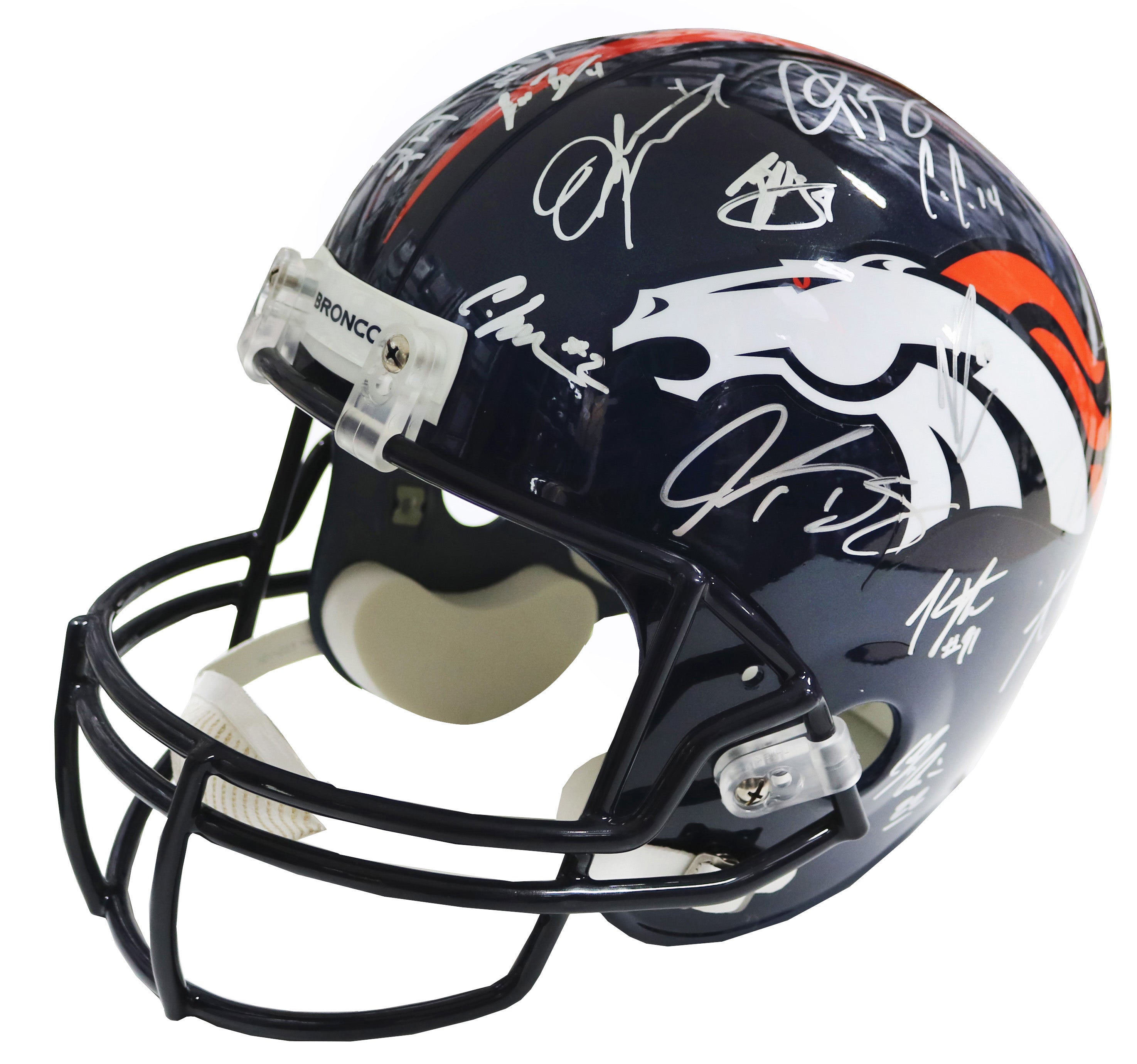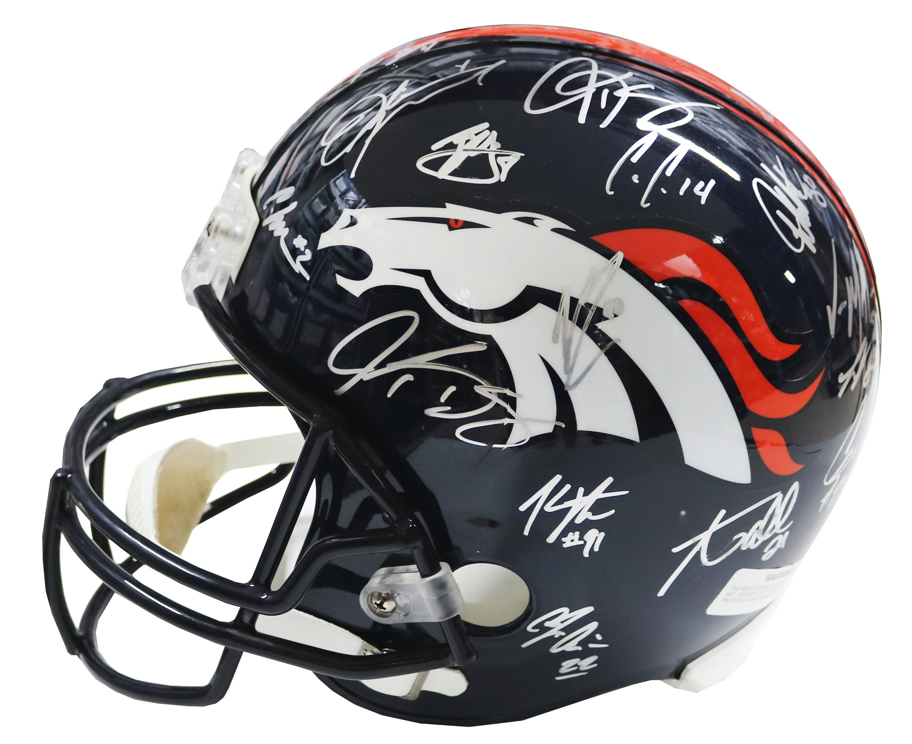 34 Total Signatures including Peyton Manning, Von Miller, Demaryius Thomas, Emmanuel Sanders, Aqib Talib, T.J. Ward, DeMarcus Ware, Brandon Marshall, Chris Harris Jr., Ronnie Hillman, Bradley Roby, Brandon McManus, Omar Bolden, Andre Caldwell, Bennie Fowler, Shaquil Barrett, Kayvon Webster, Antonio Smith, Cody Latimer, Kenny Anunike, Virgil Green, and others