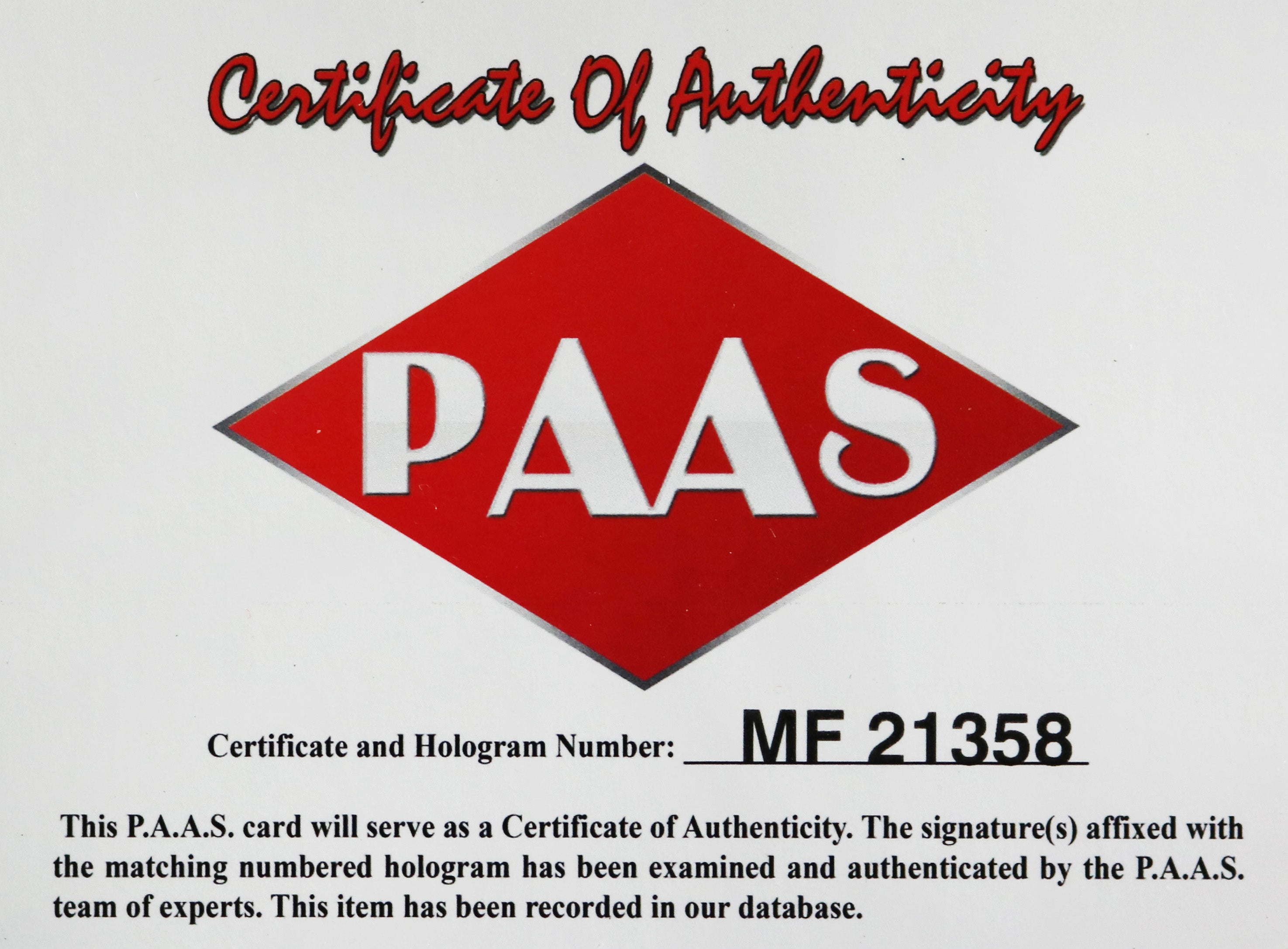 Autographed item comes with Certificate Of Authenticity (COA) Card from PAAS Professional Autograph Authentication Services