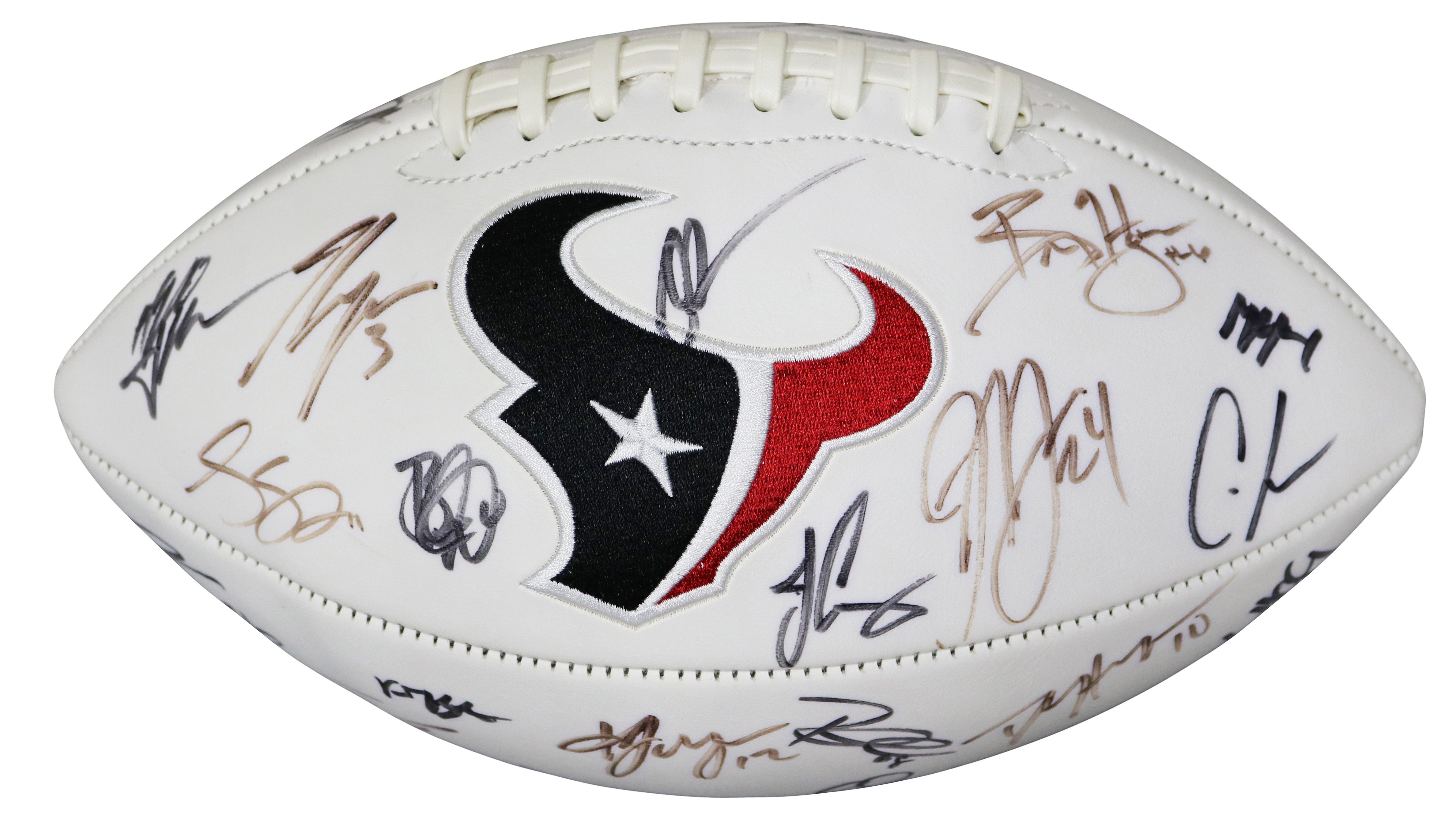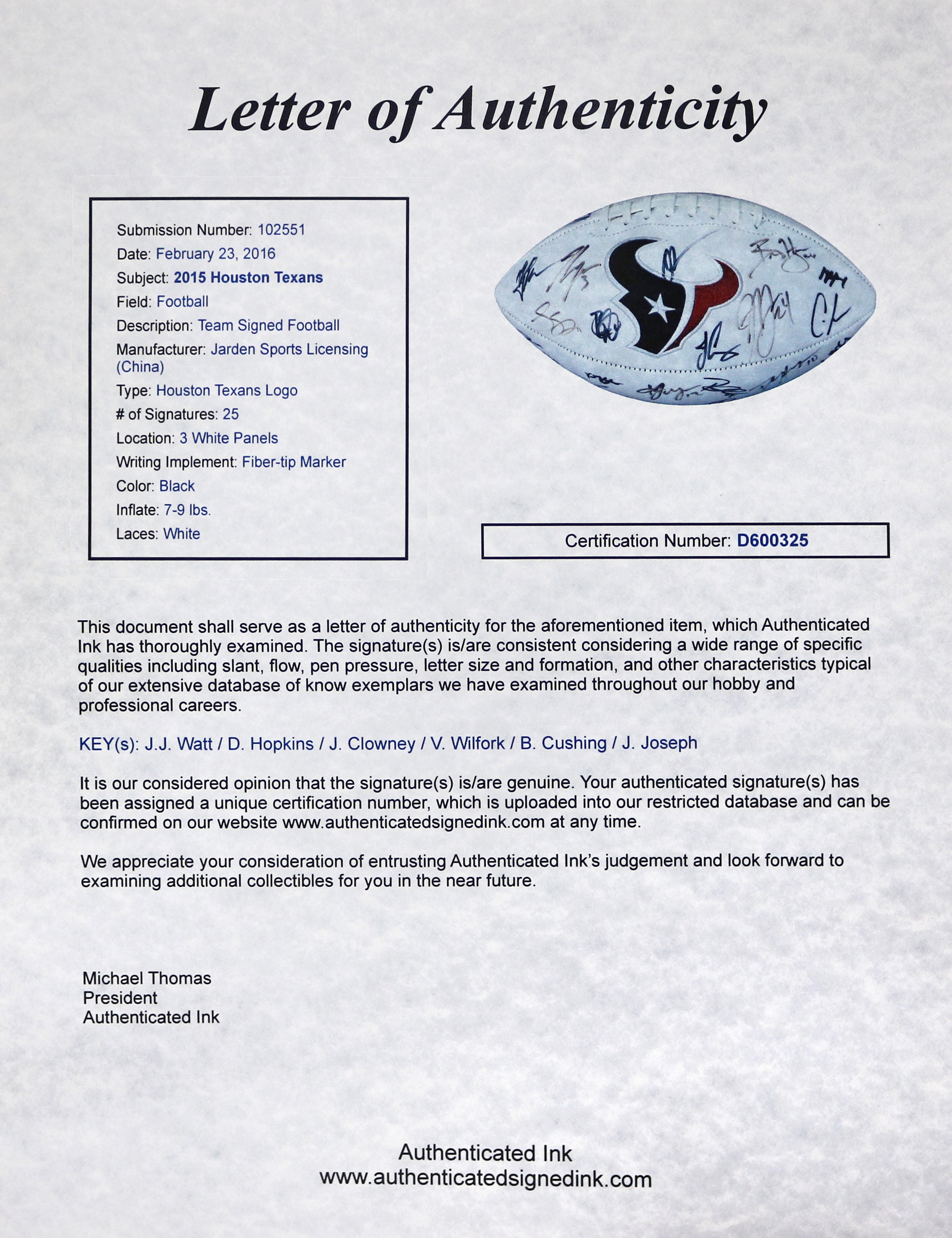 Houston Texans 2015 Team Signed Autographed White Panel Logo Football Authenticated Ink Letter COA Watt Hopkins