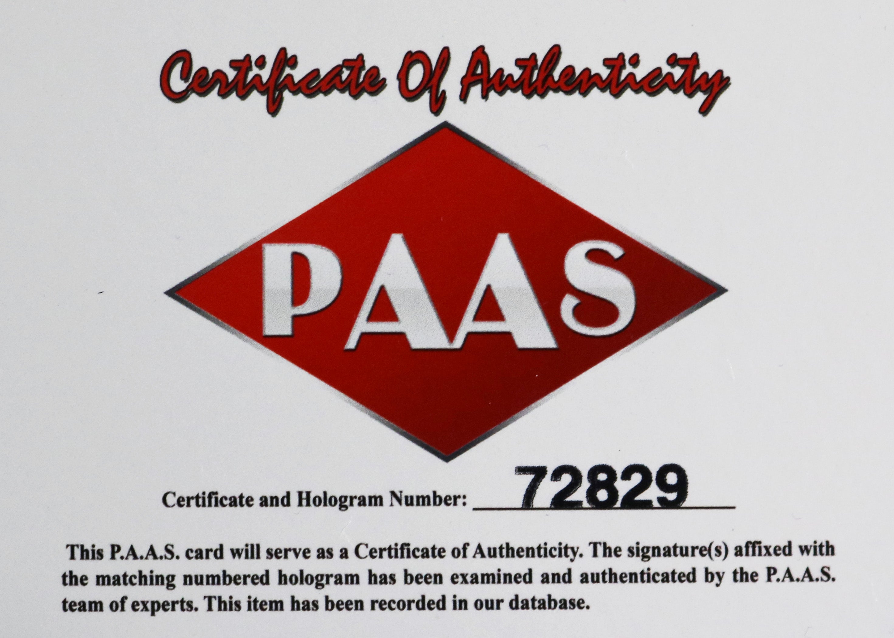 Autographed item comes with Certificate Of Authenticity (COA) Card from PAAS Professional Autograph Authentication Services