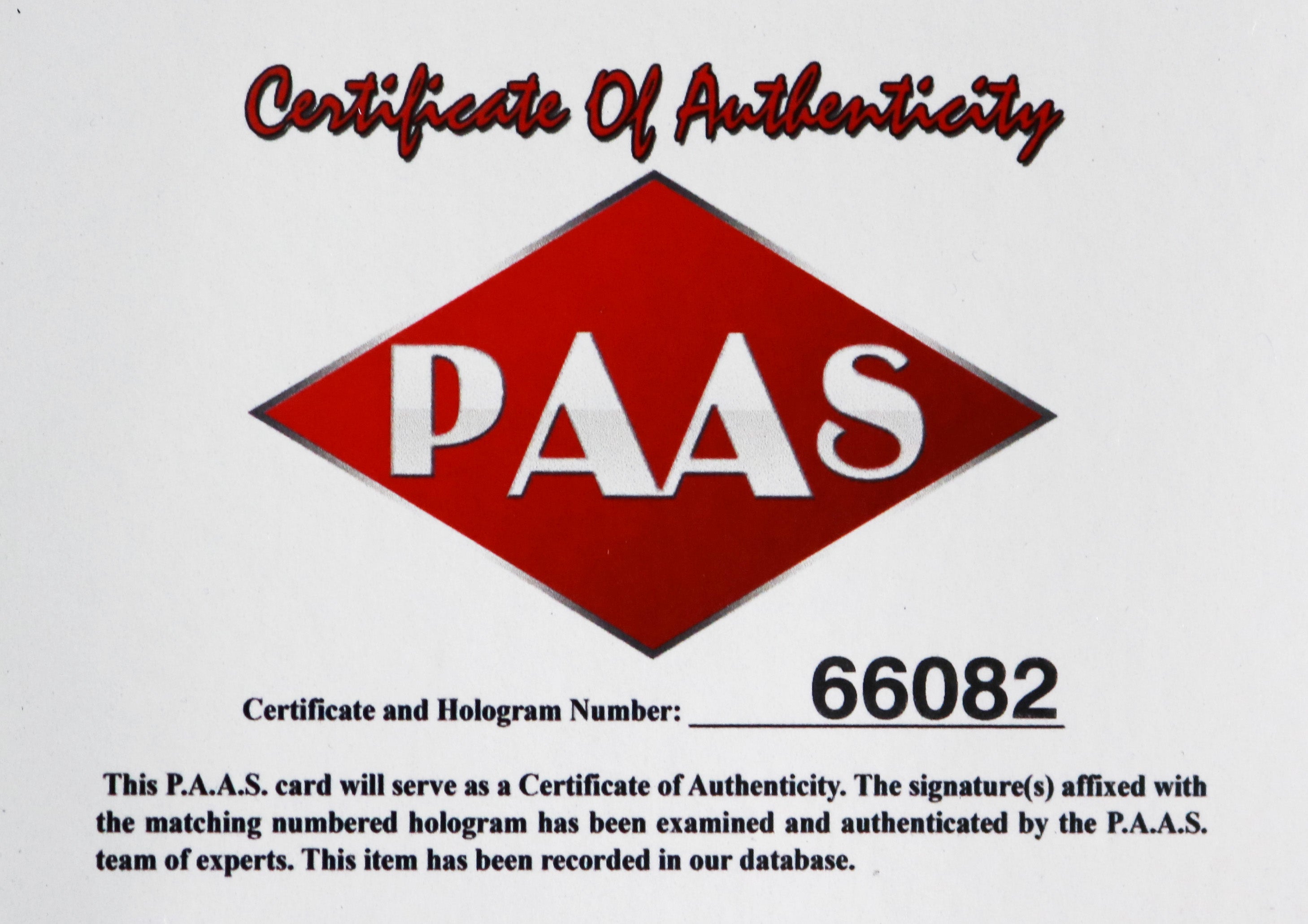 • Autographed item comes with Certificate Of Authenticity (COA) Card from PAAS Professional Autograph Authentication Services