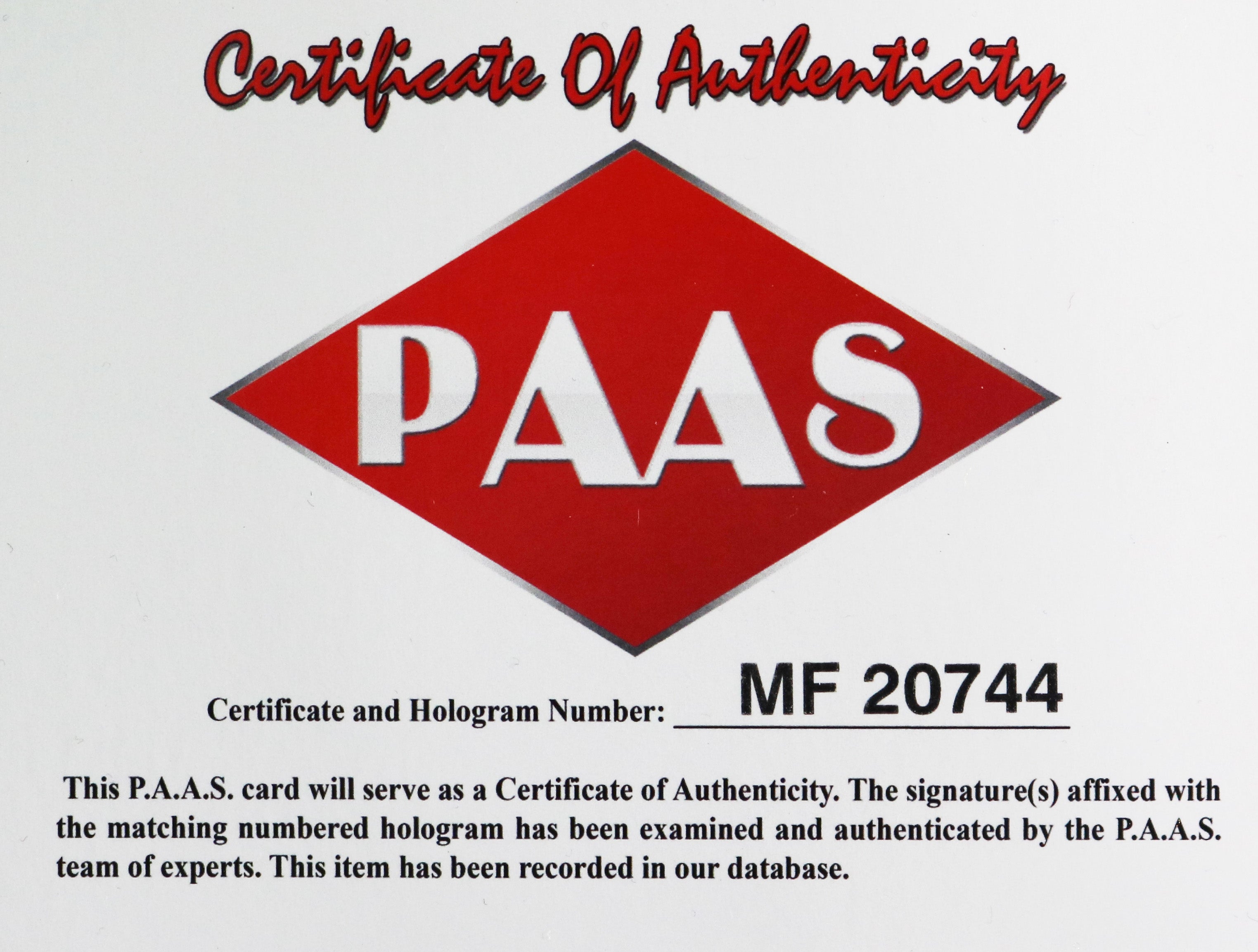 Autographed item comes with Certificate Of Authenticity (COA) Card from PAAS Professional Autograph Authentication Services