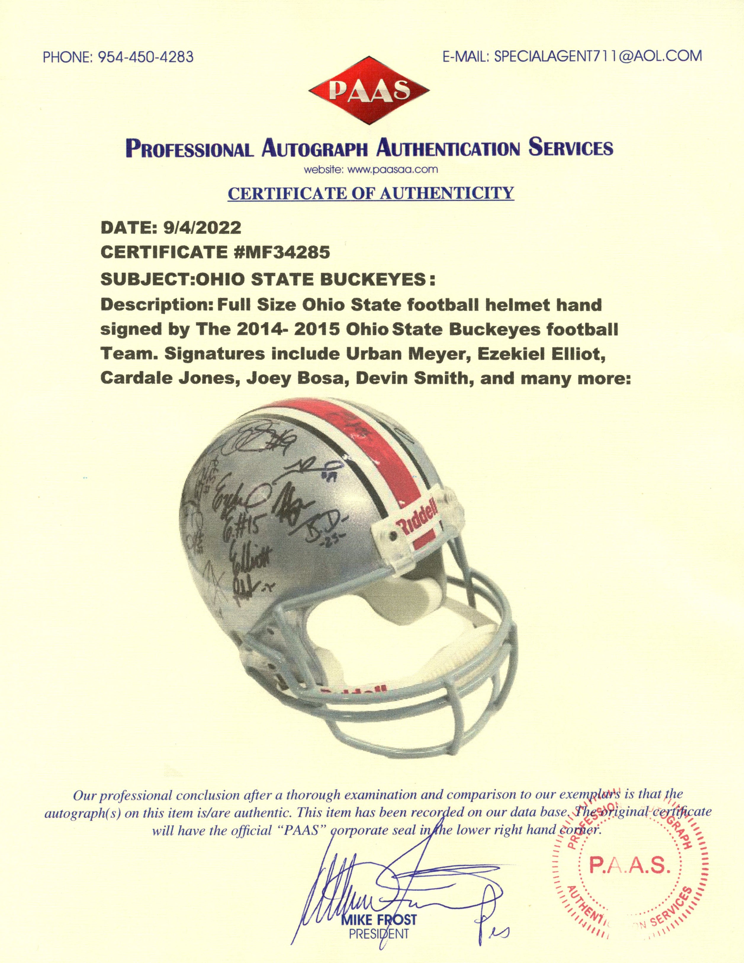 Ohio State Buckeyes 2014-2015 National Champions Team Signed Autographed Riddell Full Size Replica Helmet PAAS Letter COA