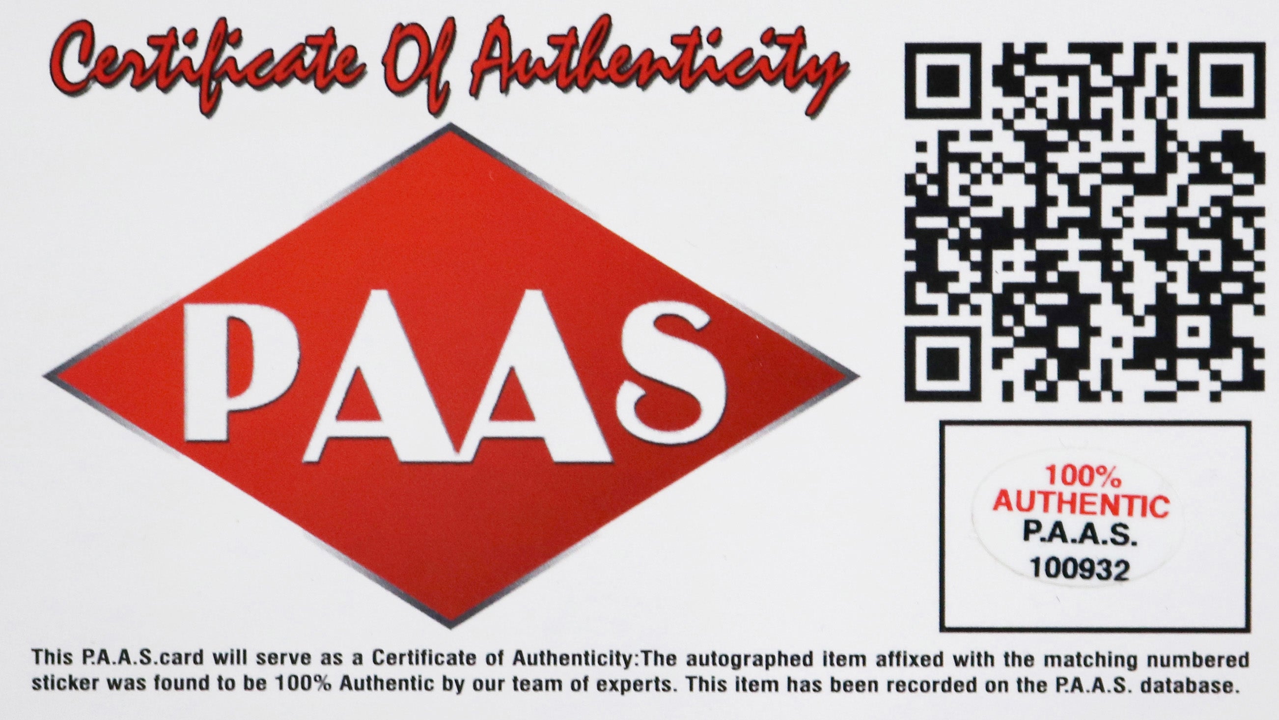 Autographed item comes with Certificate Of Authenticity (COA) Card from PAAS Professional Autograph Authentication Services