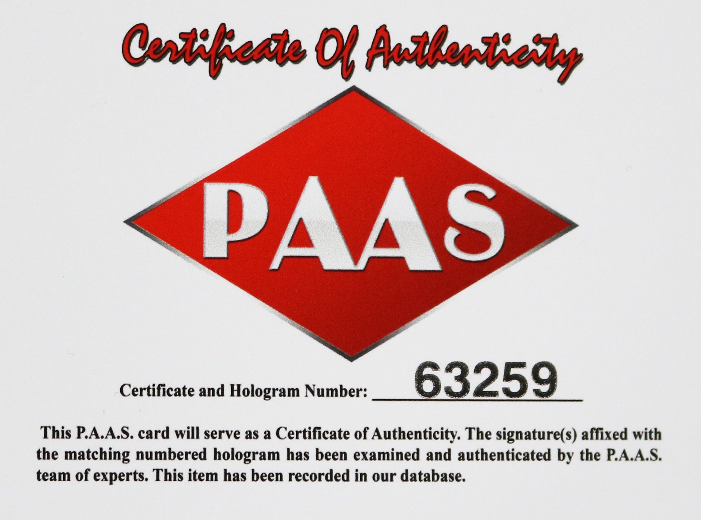 Autographed item comes with Certificate Of Authenticity (COA) Card from PAAS Professional Autograph Authentication Services