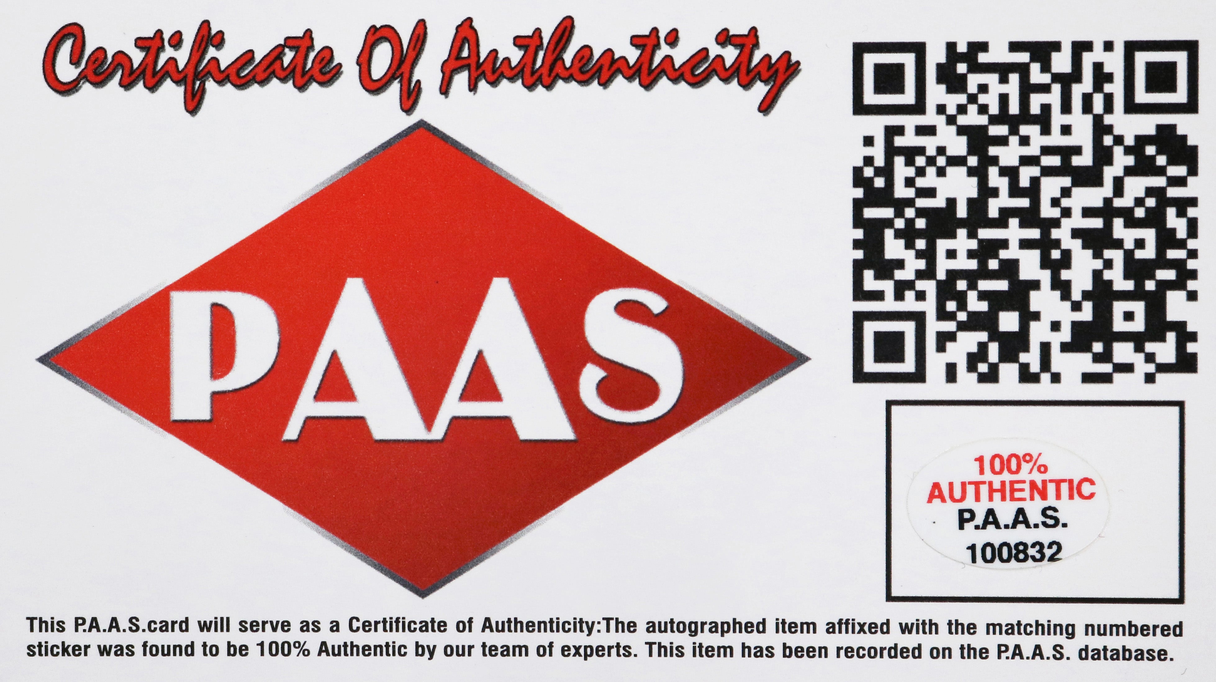 Autographed item comes with Certificate Of Authenticity (COA) Card from PAAS Professional Autograph Authentication Services