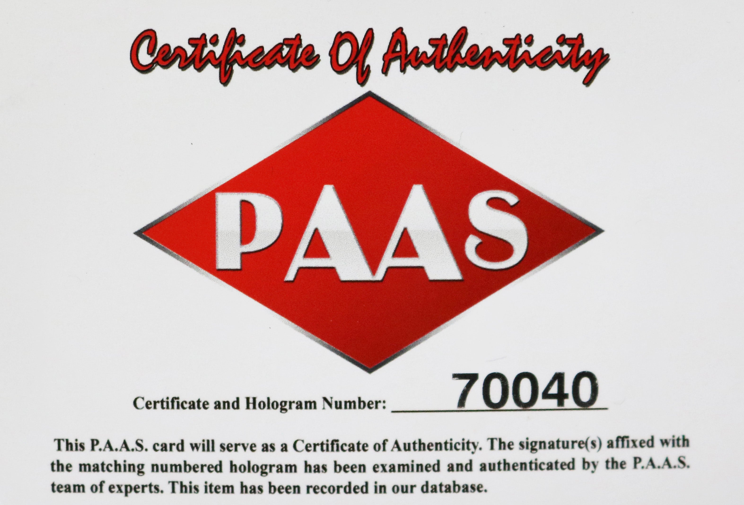 Autographed item comes with Certificate Of Authenticity (COA) Card from PAAS Professional Autograph Authentication Services