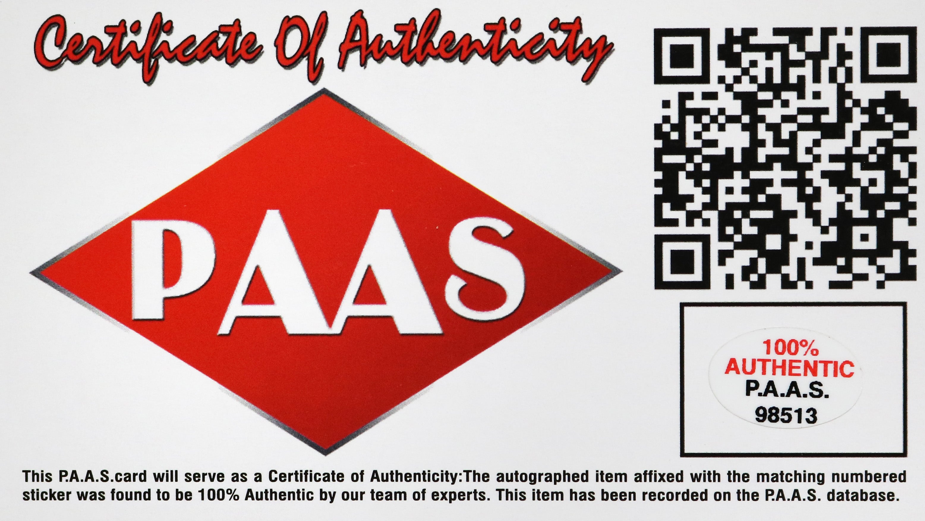 Autographed item comes with Certificate Of Authenticity (COA) Card from PAAS Professional Autograph Authentication Services