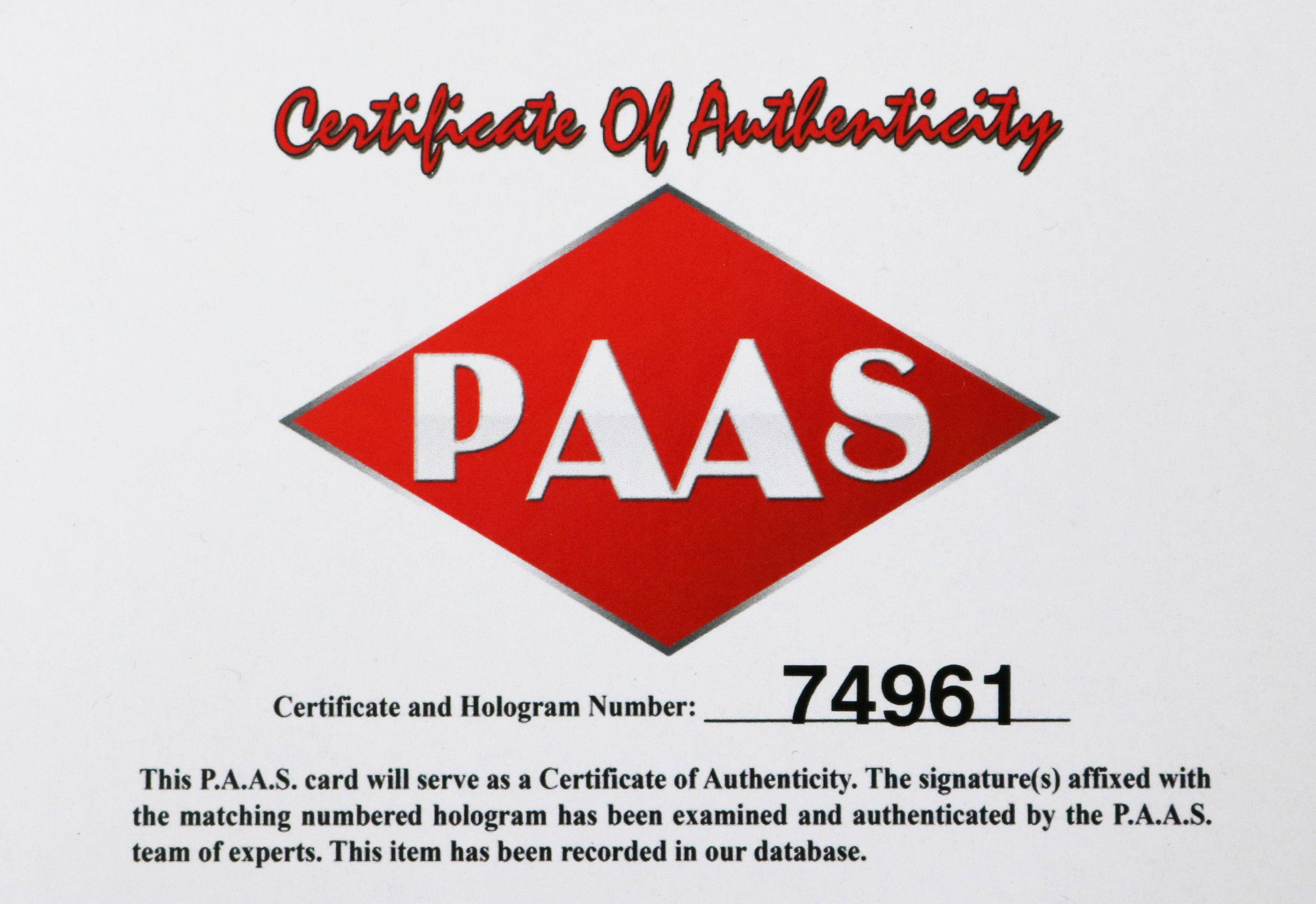 • Autographed item comes with Certificate Of Authenticity (COA) Card from PAAS Professional Autograph Authentication Services
