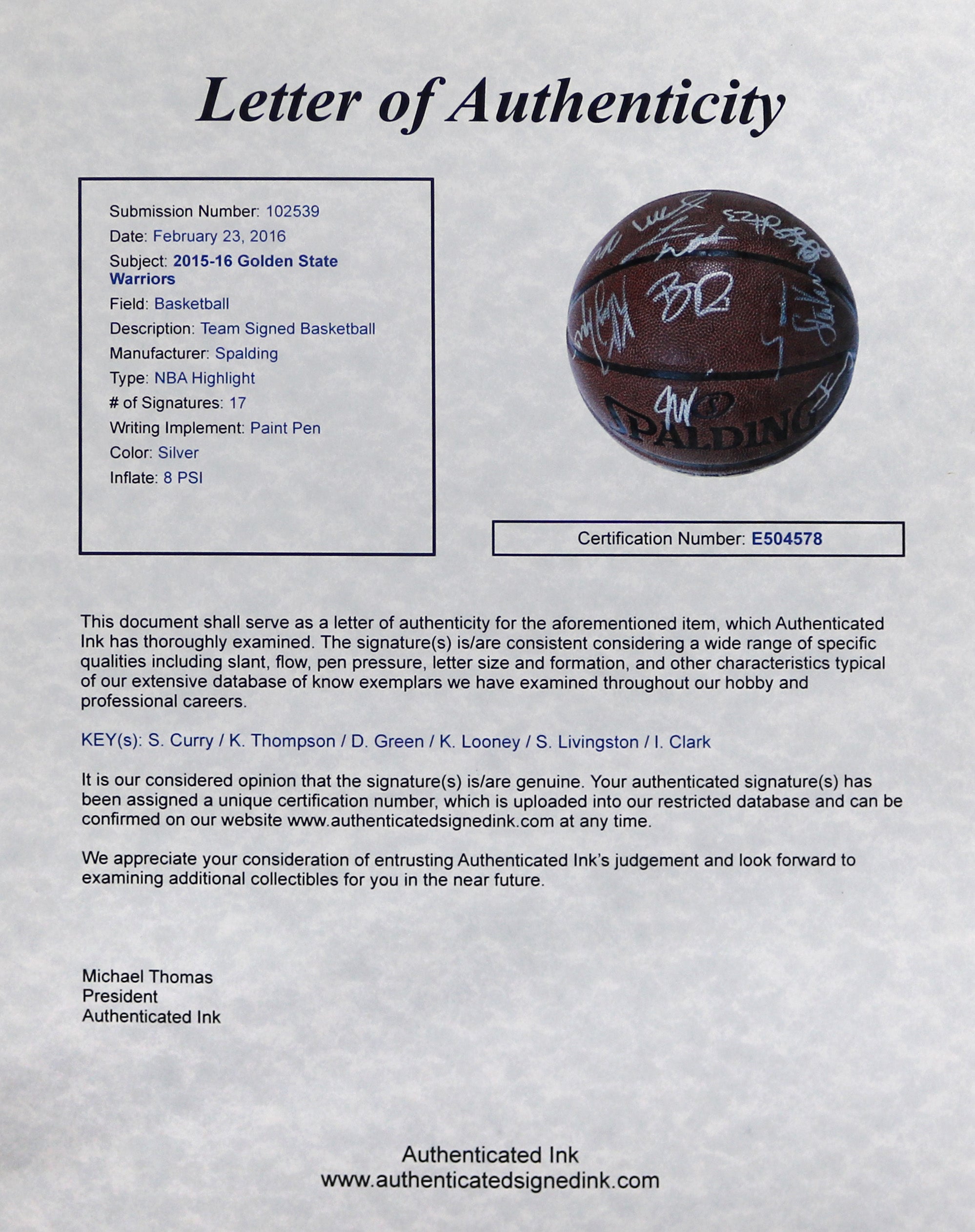 Golden State Warriors 2015-16 Team Autographed Signed Spalding NBA Basketball Authenticated Ink Letter COA Stephen Curry Klay Thompson Draymond Green