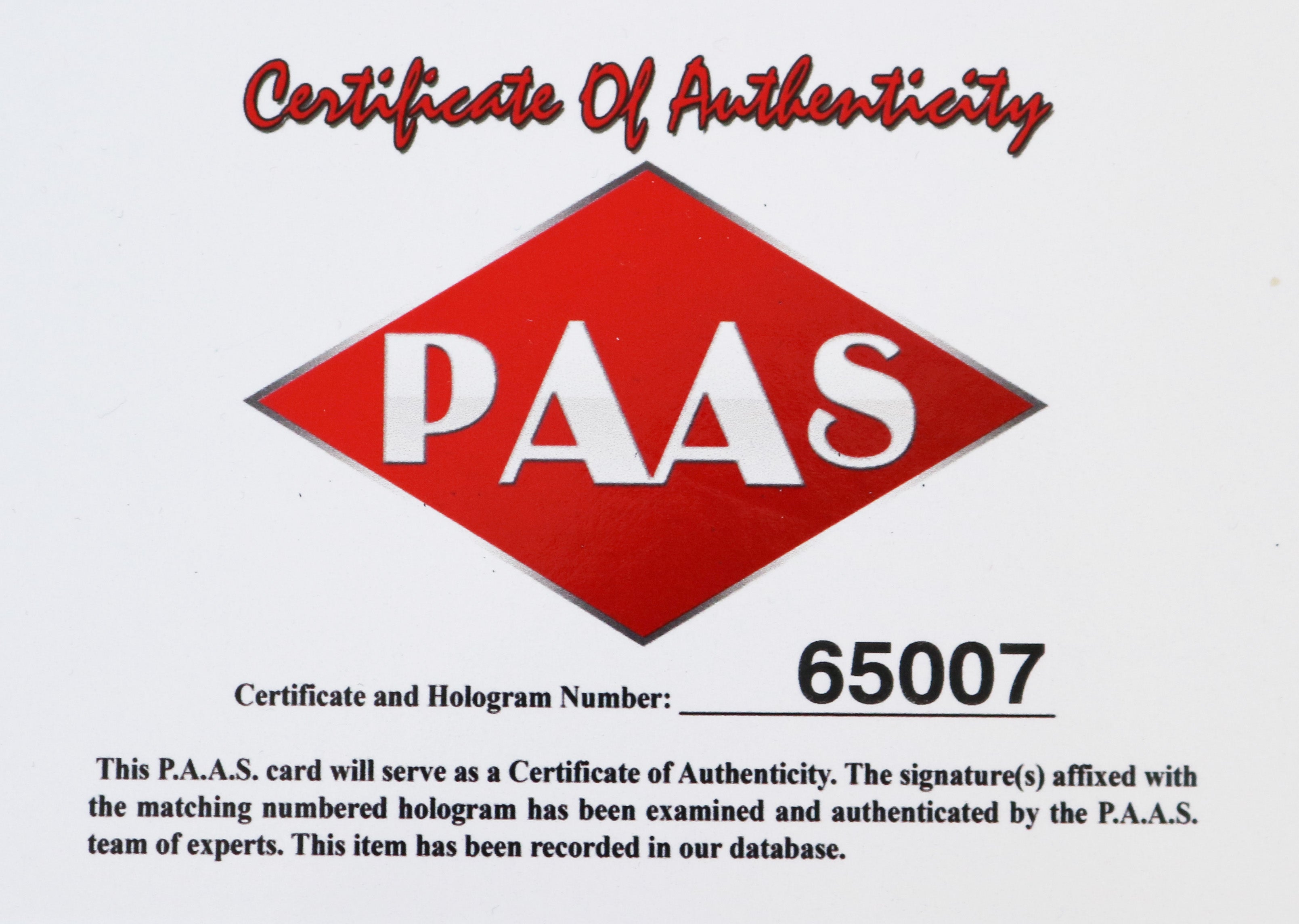 Autographed item comes with Certificate Of Authenticity (COA) Card from PAAS Professional Autograph Authentication Services