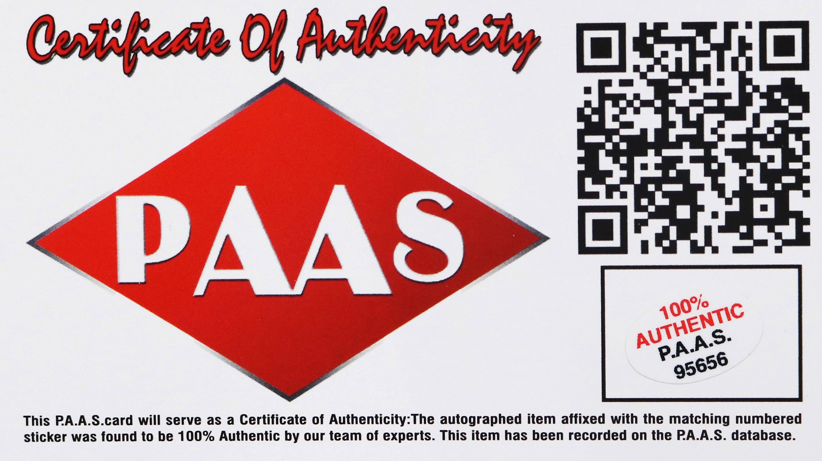 Autographed item comes with Certificate Of Authenticity (COA) Card from PAAS Professional Autograph Authentication Services